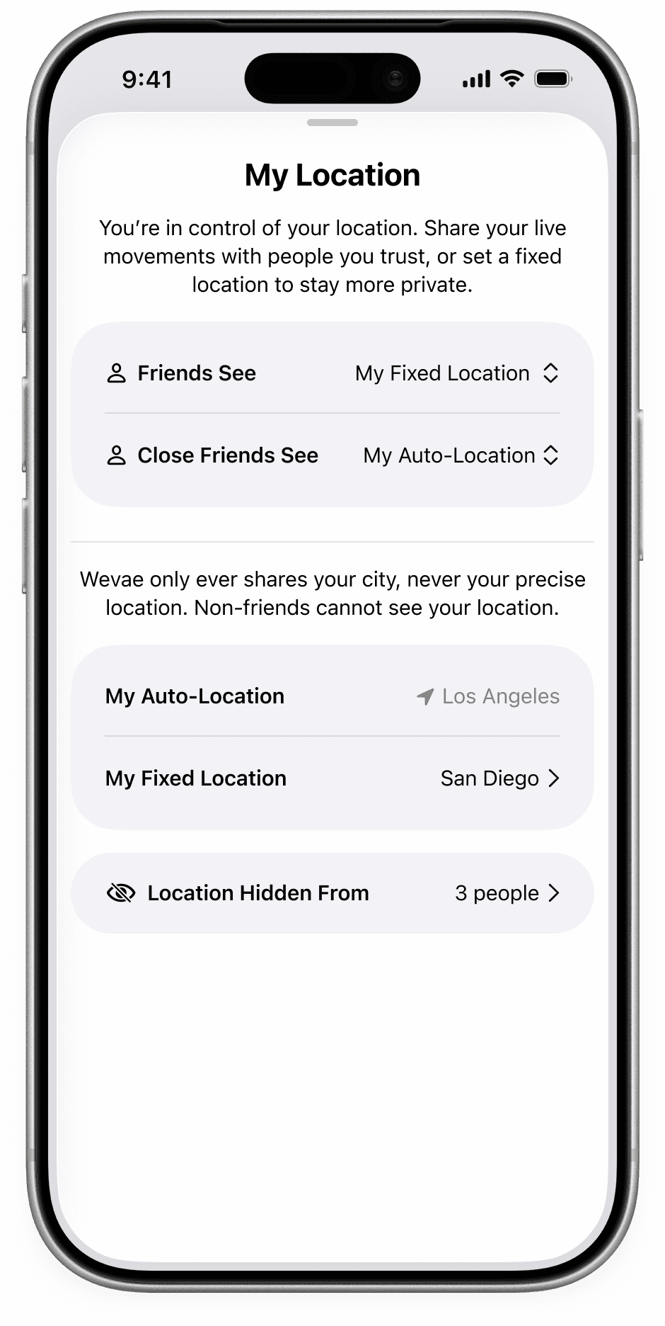 You’re always in control of your location on Wevae. We only use general, city-level location (ex. Los Angeles, US) never your exact or real-time coordinates.